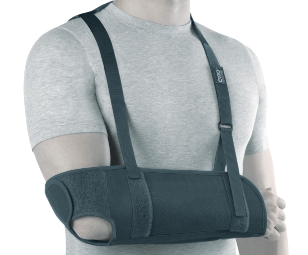 Ортез в виде универсального усиленного бандажа на верхнюю конечность для поддержки в функционально-выгодном положении. Основа выполнена из хлопчатобумажного полотна, разъемная в области локтевого сустава (нижней трети плеча). Конструкция усилена за счет моделируемого ребра жесткости. В конструкцию изделия входит ремень-подхват из нерастяжимой стропы, крепление осуществляется с помощью застежек Velсro.