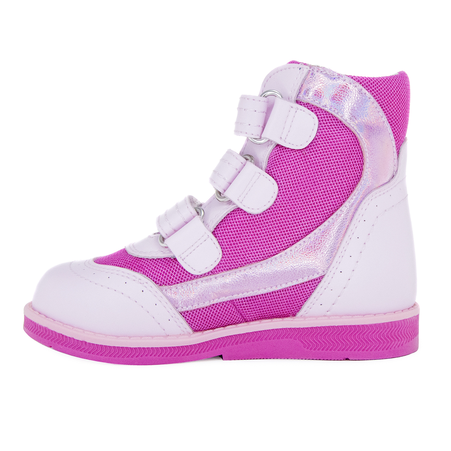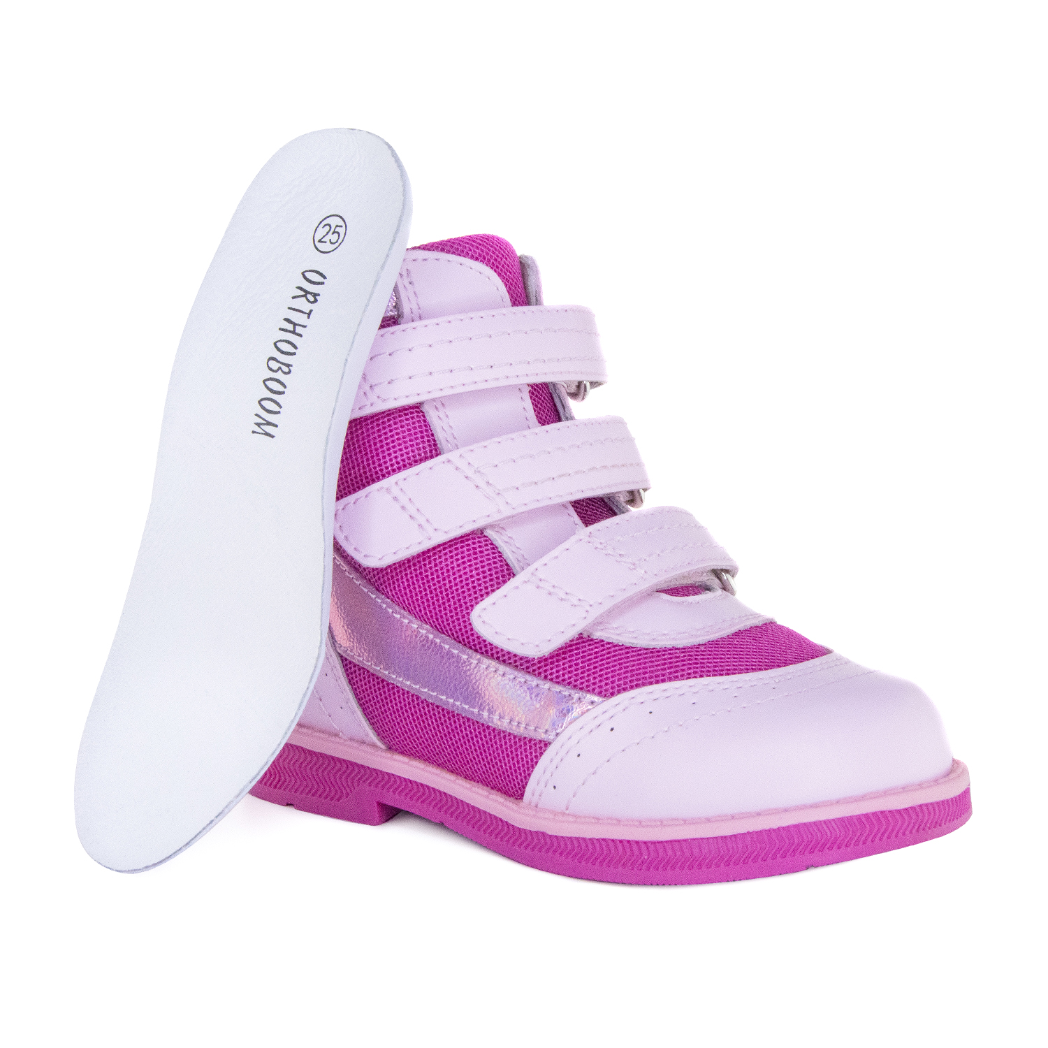 Детские ортопедические демисезонные ботинки с высоким берцем Orthoboom 81147-16 нежно-розовый с фуксией — стильная ортопедическая лечебная модель. Итальянский дизайн. Максимально комфортна для ребенка. Показаны при плоско-вальгусной деформации стопы, X-образной форме ног, ДЦП. Регистрационное удостоверение Росздравназдора. Обувь отличается особенностями в конструкции, что делает ее очень удобной для ребенка.