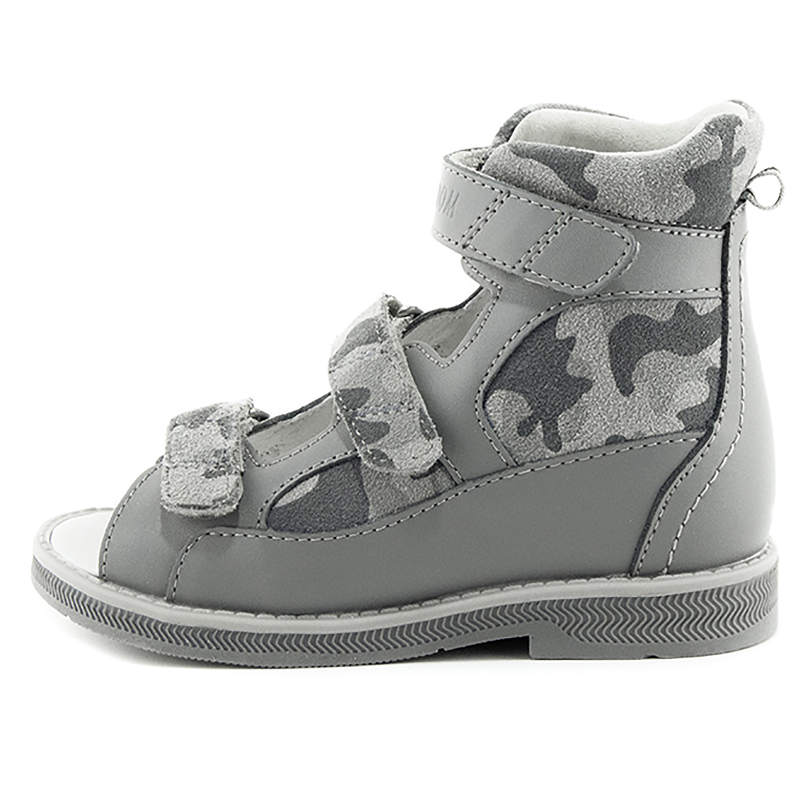 - Жесткий задник с удлиненными крыльями фиксирует пятку и голеностопный сустав, ставит ногу в анатомически правильное положение, формируя правильный стереотип походки.