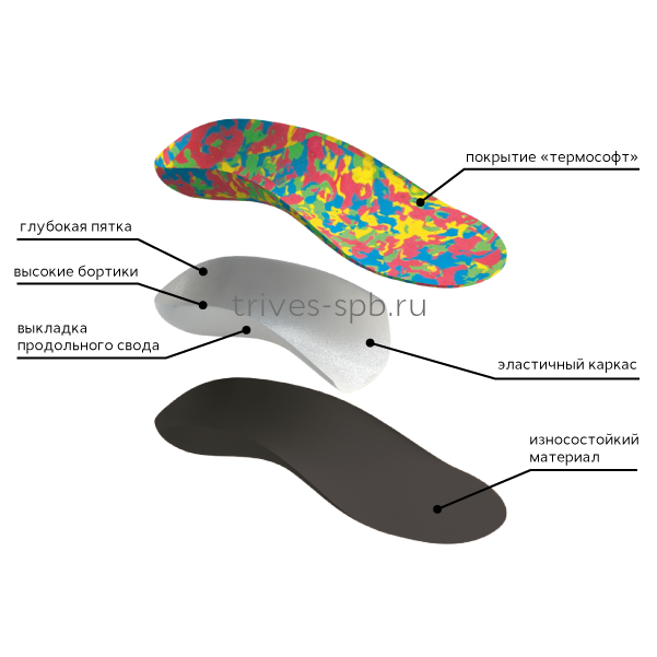- упругая каркасная основа с высокими бортиками, продленными на 2/3 стельки;