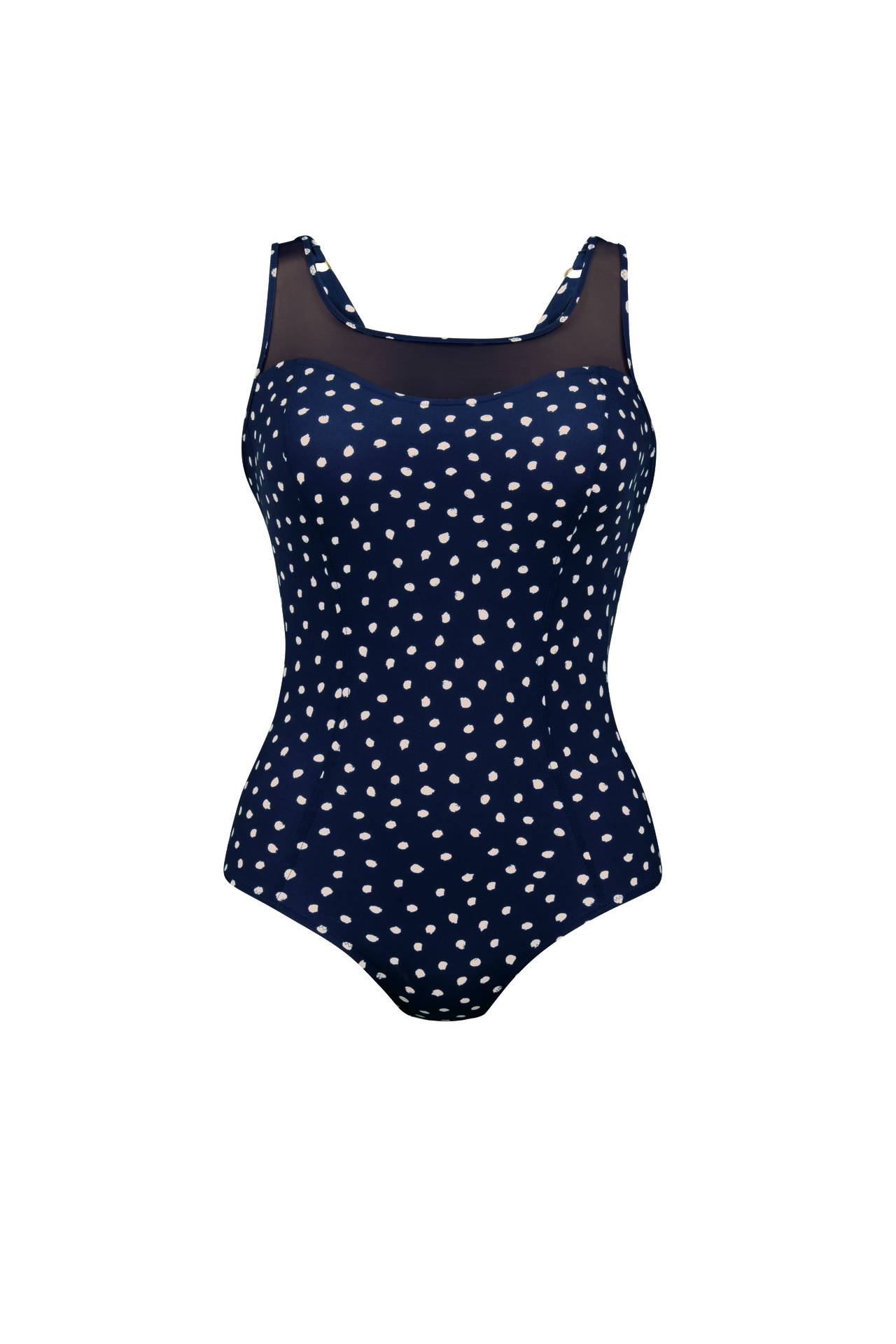 Слитный купальник в стиле 50-х годов. Очень высокая линия декольте скрывает возможные неровности, но не выглядит «глухо» — напротив, полупрозрачный тюль смотрится очень женственно и визуально облегчает зону груди.