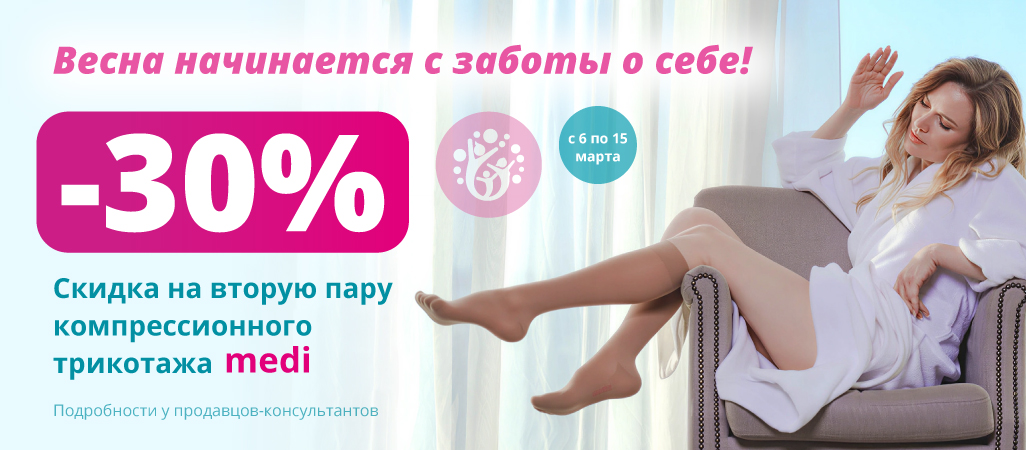 Купите 2 изделия компрессионного трикотажа Medi и получите скидку 30% на вторую пару в чеке.